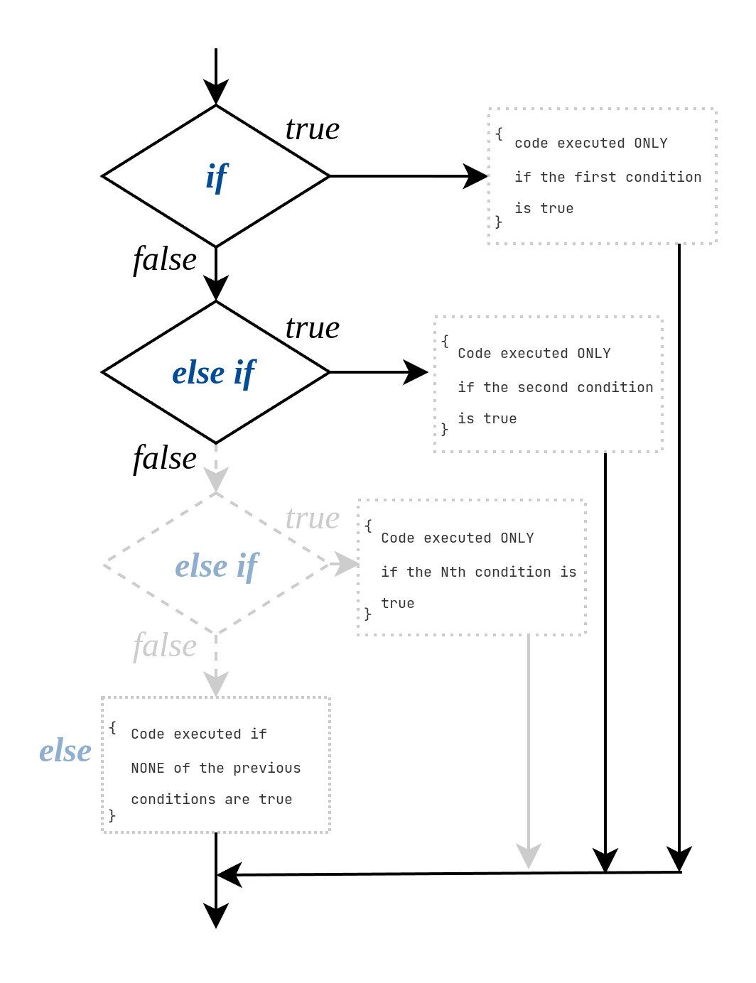 In this case, an additional else block is still optional: using if / else if doesn’t mean we’re required to add an else, but we can include one if we want to handle the case where none of the conditions were met.