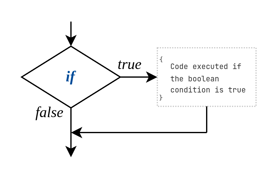 The program’s flow with an if can take an alternative path. Pay attention to the word “can”: it’s not mandatory. If the condition isn’t met, the program simply moves on without entering that block.