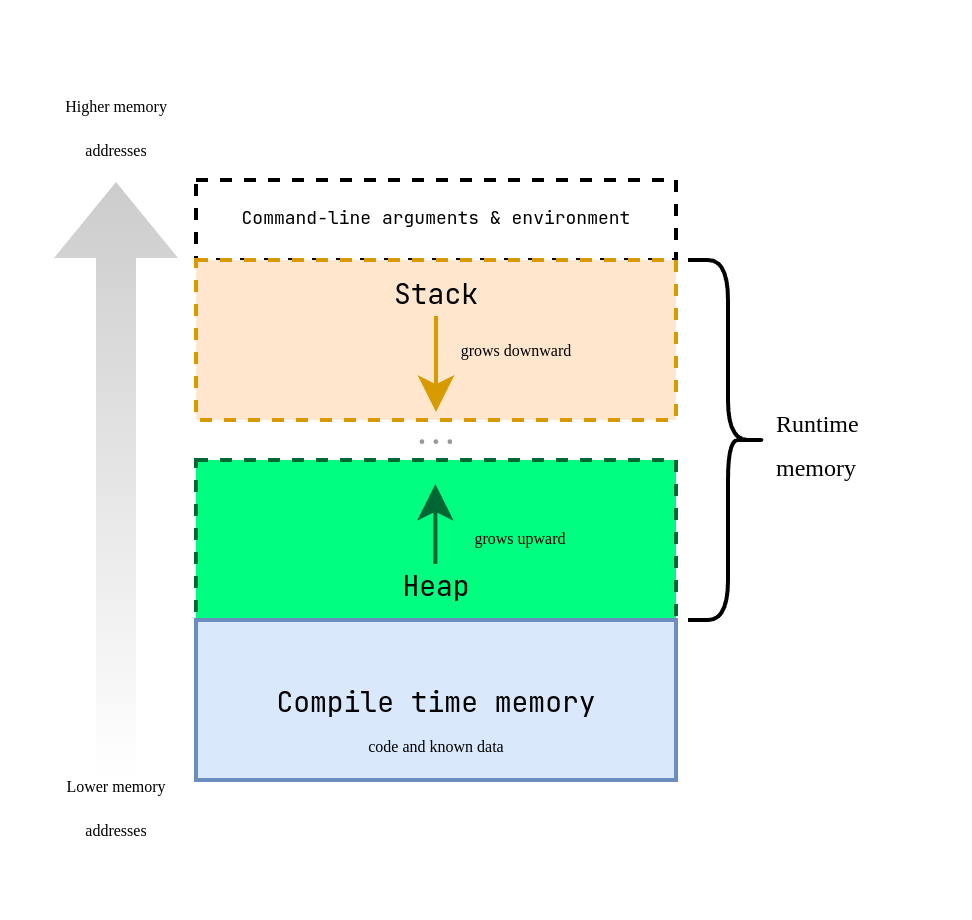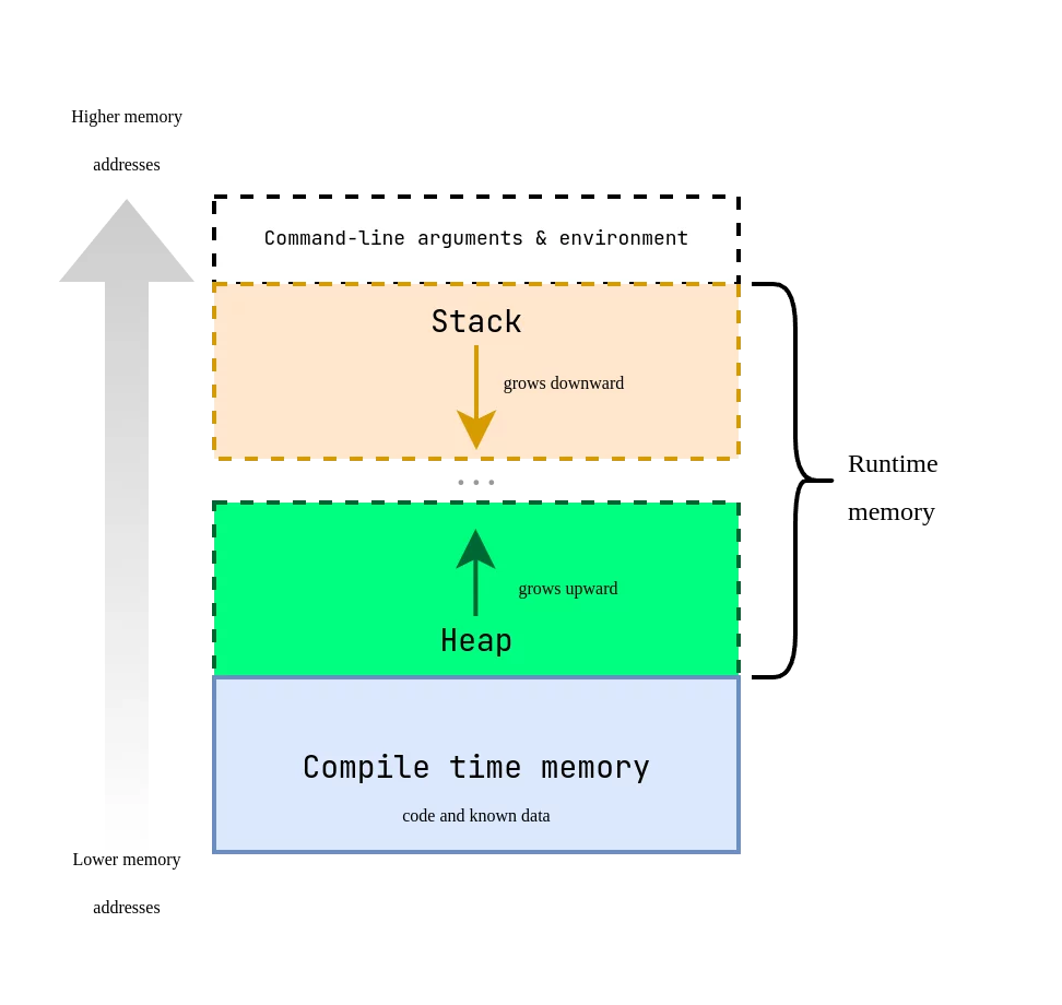 At the base of the program is compile-time memory. This part of memory holds everything Zig knows before running the program: code, literal data, constant values, and anything evaluated at comptime. It’s included in the final binary, ready to be loaded into memory when the program starts. It’s a predictable area as it doesn’t change during execution because its contents were defined ahead of time.