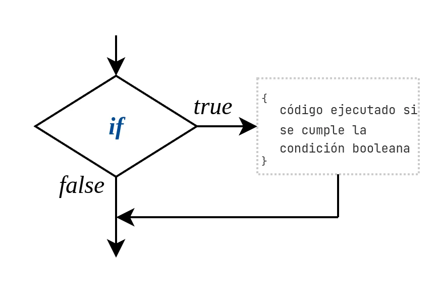El flujo del programa con un if puede tomar un camino alternativo. Fíjate en la palabra “puede” porque no es obligatorio. Si la condición no se cumple, el programa continuará sin entrar en ese bloque.