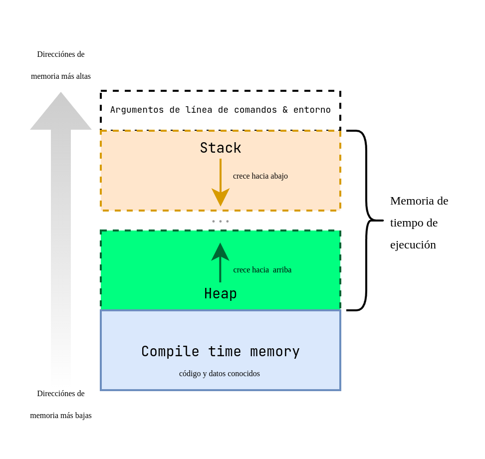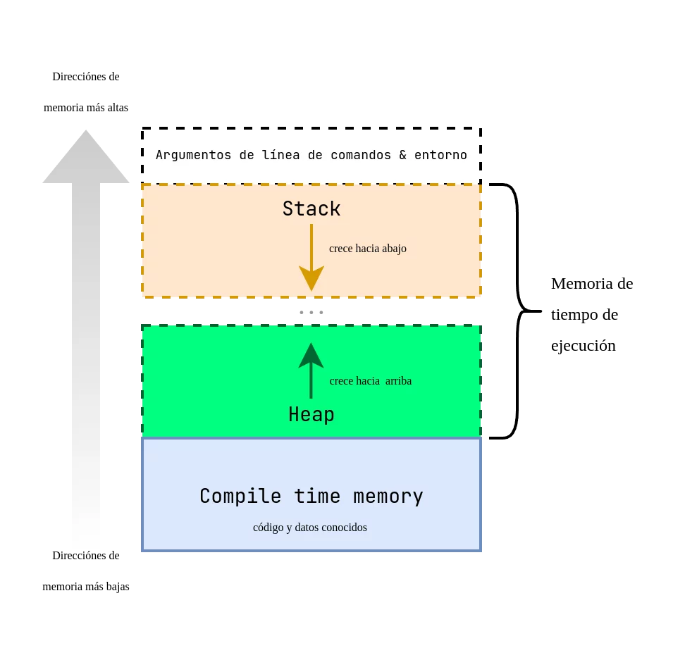 Si necesitamos espacio, lo solicitamos en tiempo de ejecución. Si hay memoria disponible, el sistema nos la concede. Si no - obtendremos un error y lo tendremos que gestionar de manera adecuada. El heap, al contrario que la stack, crece hacia arriba, desde las direcciones más bajas hacia las más altas.